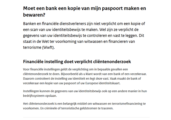 Op de website van de Rijksoverheid staat dat banken niet verplicht zijn om een kopie of scan van een identiteitsbewijs te maken of te bewaren. Ze mogen wel controleren of de gegevens kloppen, maar dat betekent, volgens mij, niet automatisch dat een digitale scan de enige manier is. (klik op onderstaande afbeeldingen om naar de site van de Rijksoverheid te gaan).